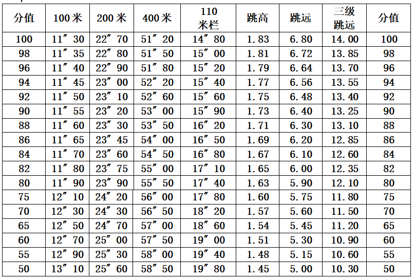 采取站立式起跑计时,男子4”0为20分。每人两次机会。